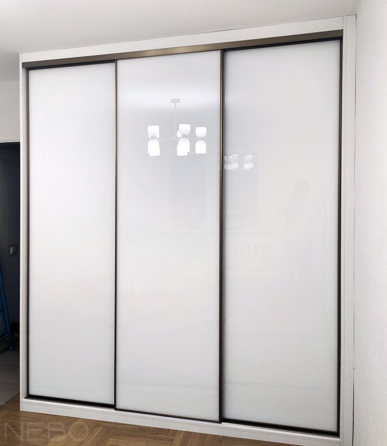 Белый глянцевый трехдверный шкаф-купе в спальню с фасадами из крашеного стекла Лакобель